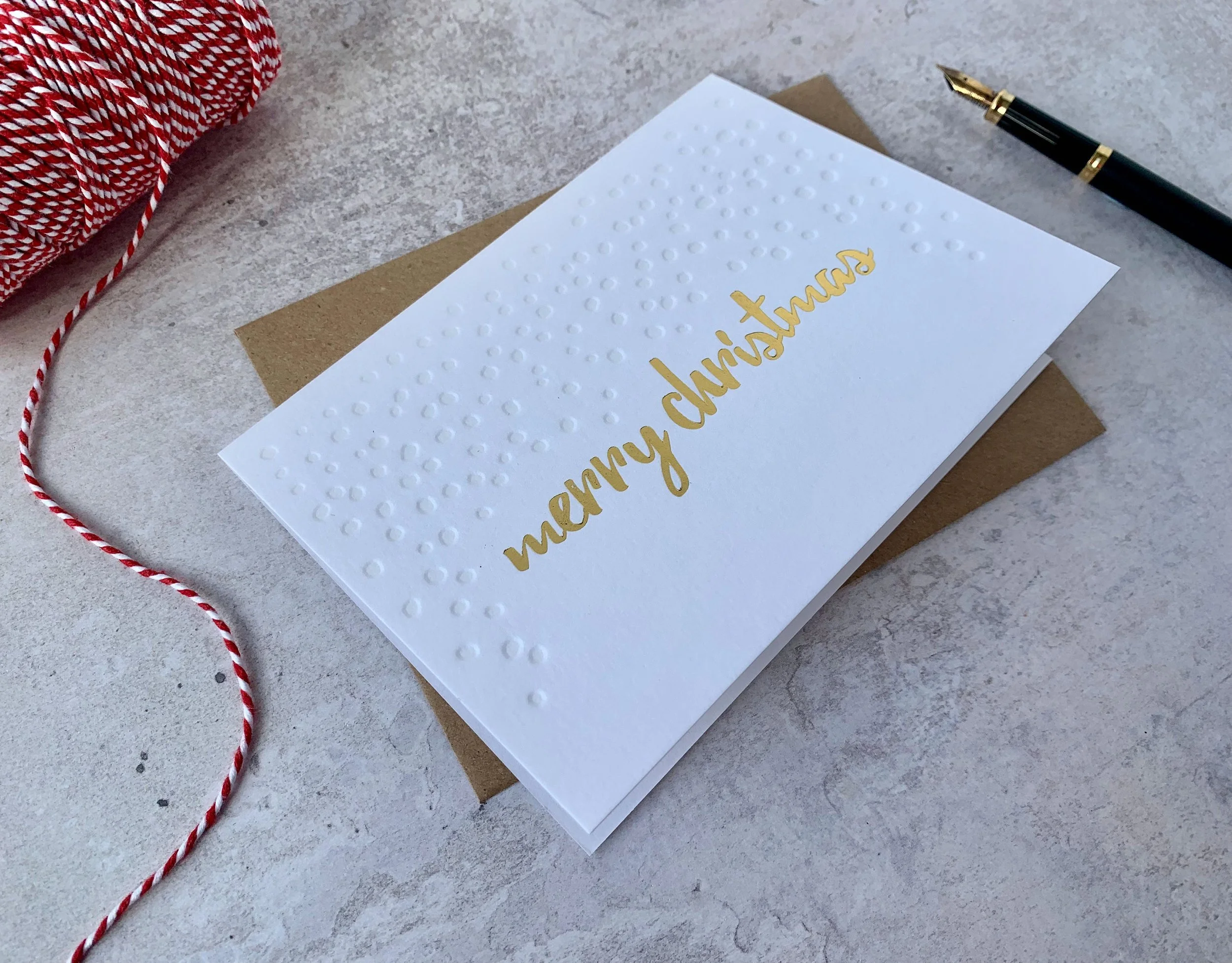 Send someone seasons greetings with this stunning, hand-crafted Letterpress Christmas card in gold foil and translucent ink, also known as a blind print. Printed on our 1913 Chandler & Price press in our studio in Edinburgh. Printed by treadle power! This Letterpress card is printed on CO2 Neutral, FSC certified card and the envelope are recycled.